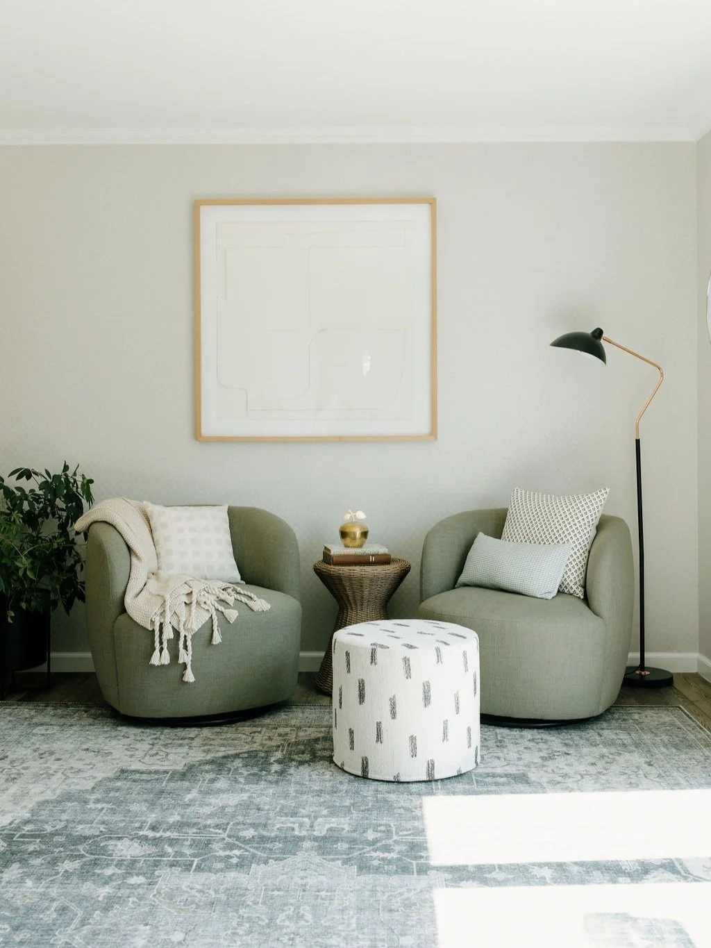 “ACCENTED WITH BLACK METAL LAMPS, A FLATWEAVE RUG, AND TEXTURED, NEUTRAL ACCESSORIES”