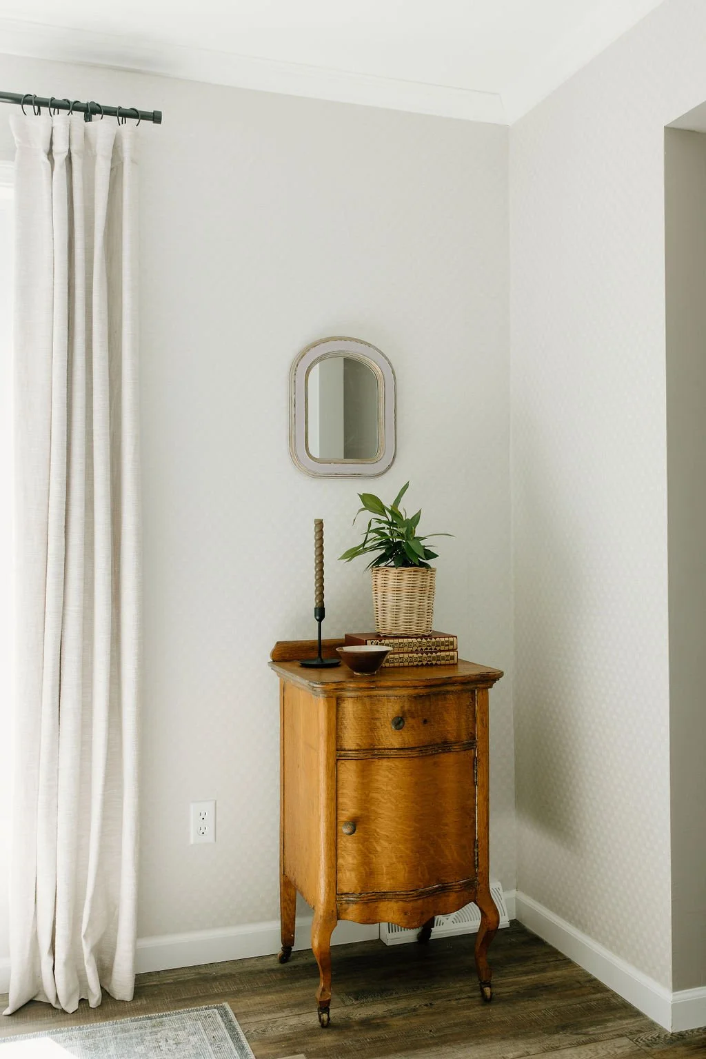 A HOME OFFICE WITH A SUBTLE, CHECKERED WALLPAPER AND WARM FURNITURE ACCENTS
